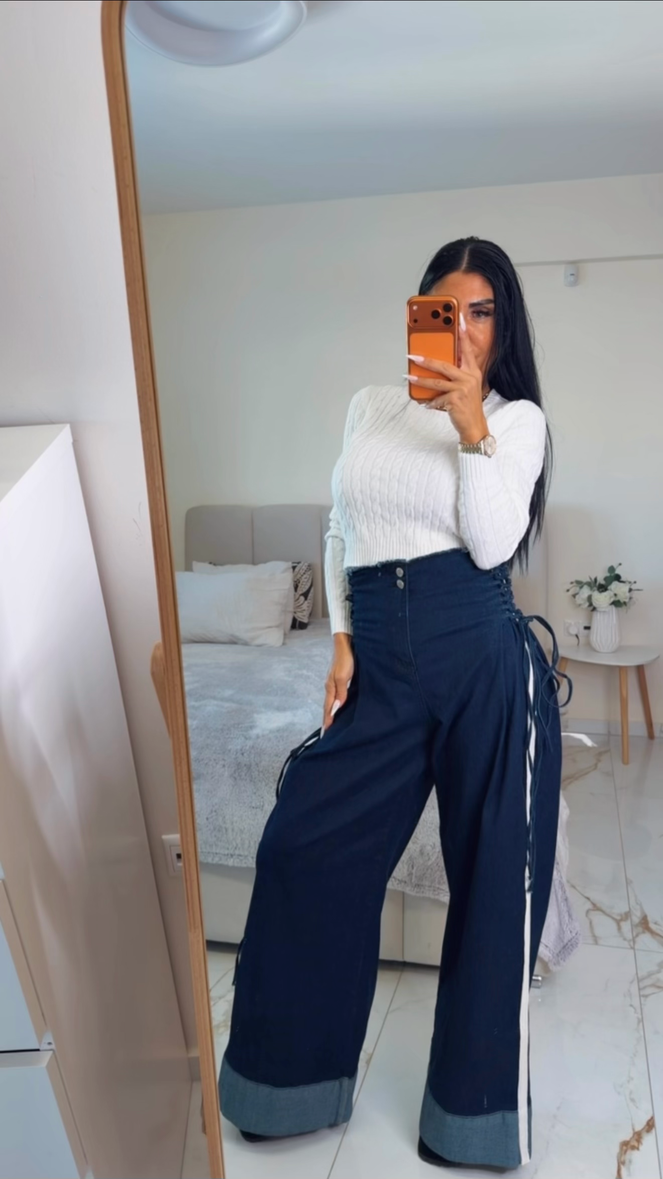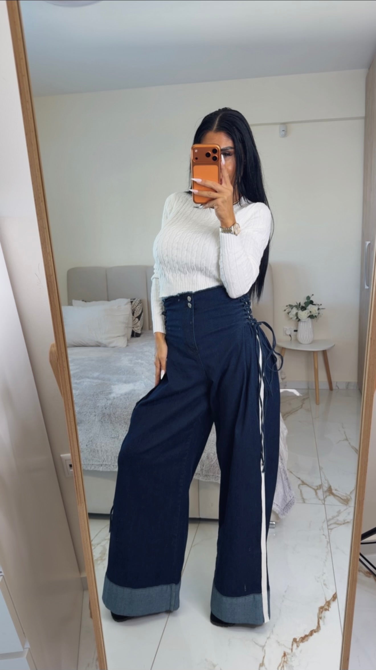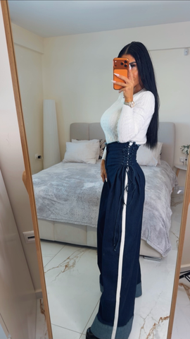 Ψηλό μέσο τζιν παντελόνι με διακοσμητική ρίγα Στα πλαϊνά με εφέστιοι κορσές στο πλάι που σφίγγει και αυξομειώνεται σε φάρδος κλείνουμε παιδιά στο μπροστινό μέρος και διαθέτει ρεβέρ στο τελείωμα